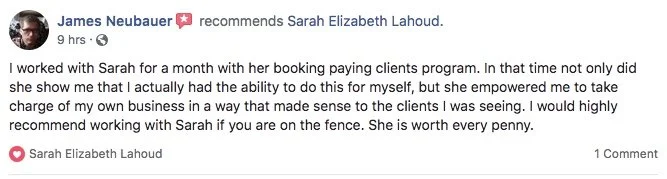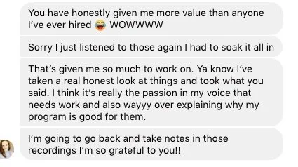 “I overcame being afraid of booking clients. I have 3 actual, paying clients when before I had zero, so that’s definitely progress! The biggest change in my business since working together has been mostly in my attitude. You gave me belief. I know I want this. I want to be successful.”